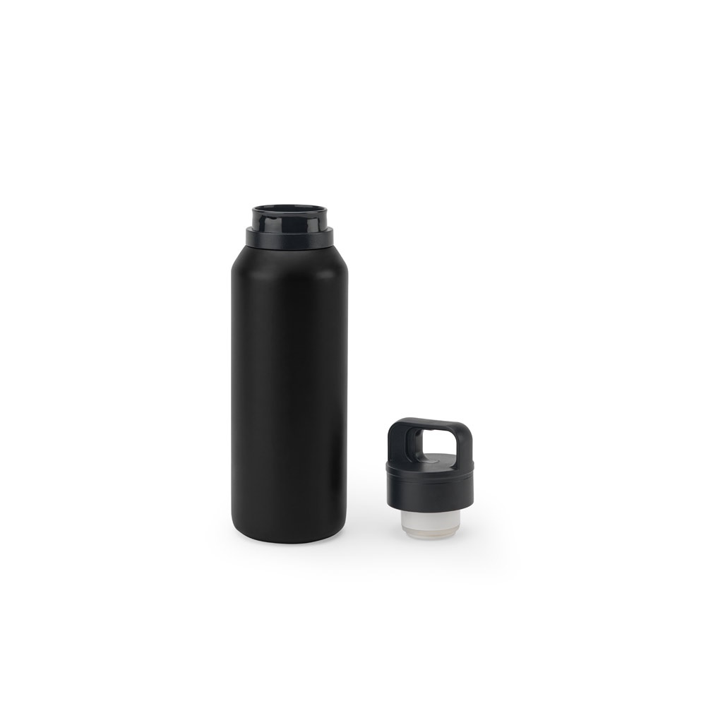 Μπουκάλι από ανοξείδωτο ατσάλι (91% ανακυκλωμένο) με διπλό τοίχωμα με μόνωση κενού και εσωτερικό τοίχωμα με επικάλυψη χαλκού, χαρακτηριστικά που σας επιτρέπουν να διατηρείτε τη θερμοκρασία των ποτών σας για μεγάλο χρονικό διάστημα. Το καπάκι από PP είναι στεγανό και ενσωματώνει κουμπί που διευκολύνει το άνοιγμά του. Το ματ φινίρισμα του μπουκαλιού του δίνει μια πιο σύγχρονη εμφάνιση. Χωρητικότητα έως 590 ml. Παραδίδεται σε κουτί δώρου από χαρτί κραφτ. ø78 x 248 mm